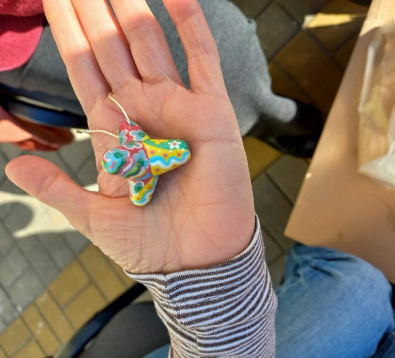 Wir waren lange unterwegs, weil wir vier Autos benützten. Eines davon war komplett zerstört, daran war buchstäblich nichts mehr intakt. Dann hatten wir den alten „Zhiguli“ unserer Eltern, den mein Mann einer jungen Familie überlassen hatte, damit sie fliehen konnte. Wir waren nicht wenige, obwohl ich nicht gezählt habe, mehrere Familien, mit vielen Kindern. Wir fuhren spontan los. Lange konnten wir uns nicht entschließen, aber irgendwann verlor die Familie des Bruders meines Mannes die Nerven, sie konnten das alles nicht mehr aushalten und brachen auf, setzten sich einfach ins Auto und fuhren zu mir. Und mein Mann bestand darauf, dass ich mitfuhr, er zwang mich buchstäblich, ins Auto einzusteigen. Er ließ mich nicht einmal mehr in unsere Wohnung. Deshalb habe ich nur ganz wenige Sachen mitgenommen, in einem kleinen Rucksack von fünf Litern. Mein Notebook mit Aufzeichnungen ließ ich zurück (ich wäre damit kaum durchgekommen, wenn man mich irgendwo an einem Checkpoint angehalten hätte). Allerdings habe ich unser Souvenir von Mariupol mitgenommen – das habe ich immer dabei. Das ist eine kleine Kopie eines Tetrapod. Seinerzeit wurden solche Konstruktionen in der Stadt aufgestellt, um die Uferlinie zu verstärken, dann hat man die grauen Gebilde bemalt, und die Tetrapode wurden zu einem beliebten Souvenir als Symbol von Mariupol.