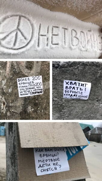 „Nein zum Krieg!“, „Mehr als 200 Brjansker wurden zu \'Grus 200\' [Fracht 200 – gefallene Soldaten]. Das sind mehr als in 10 Jahren Afghanistan-Krieg! STOP WAR“, „Schluss mit den Lügen! Bringt die Soldaten zurück nach Hause. Nein zum Krieg!“, „Wie schlaft ihr, Brjansker? Träumt ihr nicht von toten Kindern?“