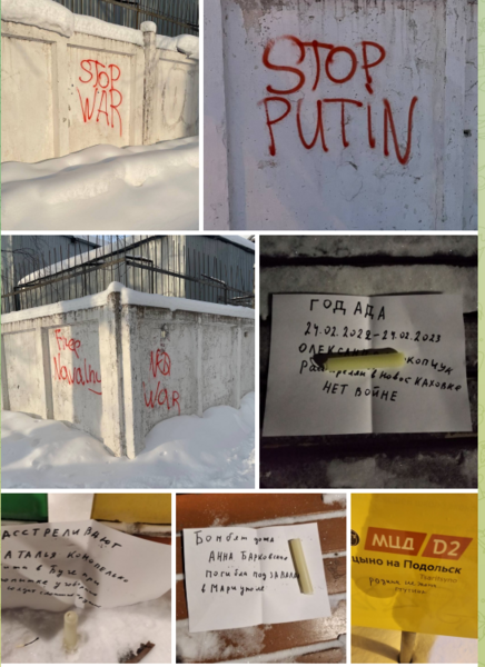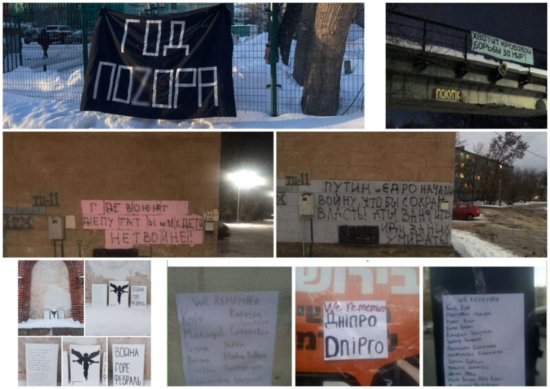 Transparente in Perm “Ein Jahr poZora“ [Wortspiele aus dem russischen Wort für Schande und dem Z-Zeichen der russischen Streitkräfte] und Ivanovo „Genug mit dem blutigen Kampf für Frieden“, Graffiti „Wo kämpfen die Abgeordneten und ihre Kinder? Kein zum Krieg!“, „Putin und die EdRo [Abkürzung für die Partei Einiges Russland] haben den Krieg begonnen, um ihre Macht zu schützten. Und du, Vanja, geh\' für sie sterben!“