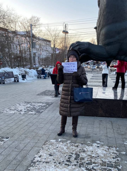 Am 24. Februar wurde in Komsomolsk am Amur Nadezhda Filimonova festgenommen mit dem Plakat „Wir trauern. Verzeiht uns, dass wir das Land versaut haben.“