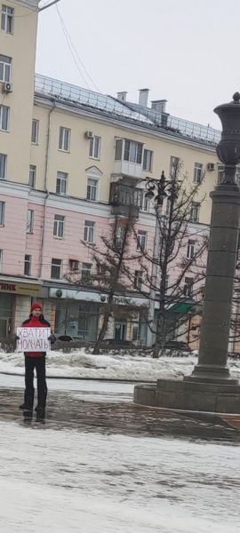 22.02.23. In Jekaterinburg wurde am Lenin-Denkmal Dmitrij Gluchov bei einer Einzelkundgebung mit dem Plakat „Das Wort gibt es nicht, aber den Krieg“ festgenommen.