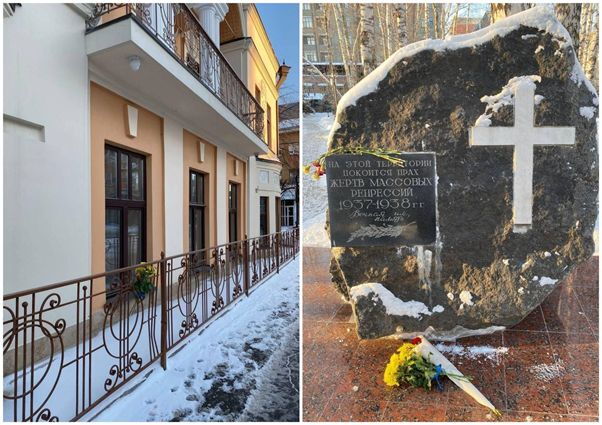 Tjumen. Blau-gelbe Blumen vor dem ehemaligen Konsulat der Ukraine. Gedenkstein für die Opfer politischer Repressionen.