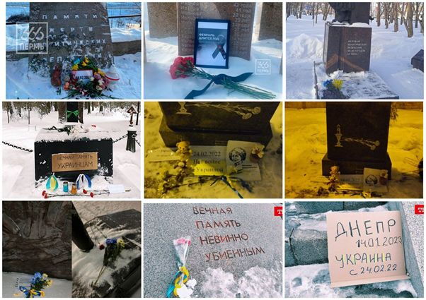 Denkmäler in Jekaterinburg und Aramil („24.02.2022. Der Februar dauert ein Jahr. Von so vielen Sünden kann man sich nicht reinwaschen, es gibt nicht genug Gebete.“), Velikie Luki, Kazan („Nein zu Putins Krieg!“, Ukrainische Städtenamen), Kaliningrad („Die Toten dieses Friedhofs rufen nach Frieden“, Kirovograd („24.2.2022 - ? Nein zum blutigen Krieg. Frieden der Ukraine. Freiheit für Russland“, „Ewiges Gedenken den Getöteten in der Ukraine“).