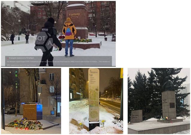 Am 24. Februar gingen die Menschen in Russland mit Blumen, Kerzen und Gedenktafeln zu den spontan eingerichteten Gedenkorten für die Opfer des Raketenangriffs in Dnipro, um ihre Unterstützung für die Ukraine zu bekunden. Solche Gedenkorte gibt es inzwischen in über zwanzig Sätdten, darunter an den Denkmälern für Lesja-Ukrajinka, Taras Schevtscheko, Bogdan Chmelnizkij, den Opfern für politische Verfolgungen und Kriege.