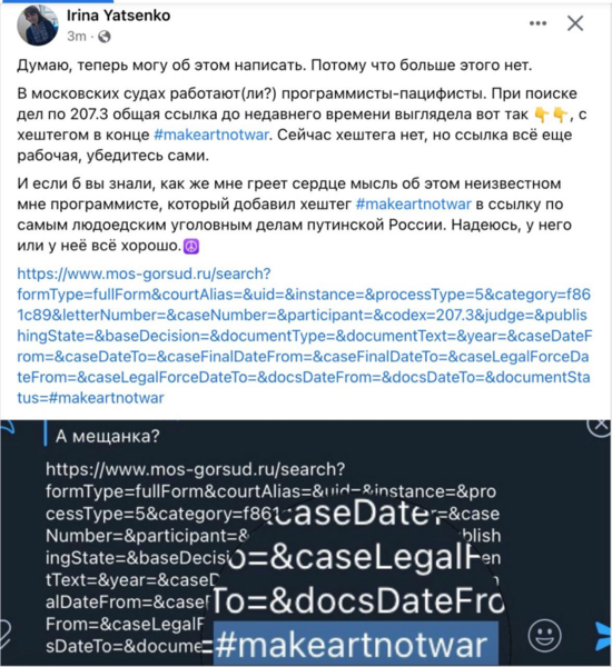 Die Menschenrechtsaktivistin Irina Jazenko machte auf unauffälligen Protest von Programmierern im Staatsdienst aufmerksam und schrieb darüber auf ihrer Facebook-Seite: „Ich denke, nun kann ich darüber schreiben. Denn jetzt gibt es das nicht mehr. In Moskauer Gerichten arbeiten wohl pazifistische Programmierer? Bei der Suche nach Prozessen, die unter Paragraph 207.3 fallen, sah ein allgemeiner Link bis vor kurzem so aus, mit Hashtag am Ende #makeartnotwar. Den Hashtag gibt es nicht mehr, aber der Link funktioniert noch, überzeugt euch selbst. Wenn ihr wüsstet, wie sehr mir der Gedanke an den unbekannten Programmierer das Herz wärmt, der den kannibalistischsten Strafverfahren des putinistischen Russlands den Hashtag #makeartnotwar hinzugefügt hat. Ich hoffe, dass es ihm oder ihr gut geht.“