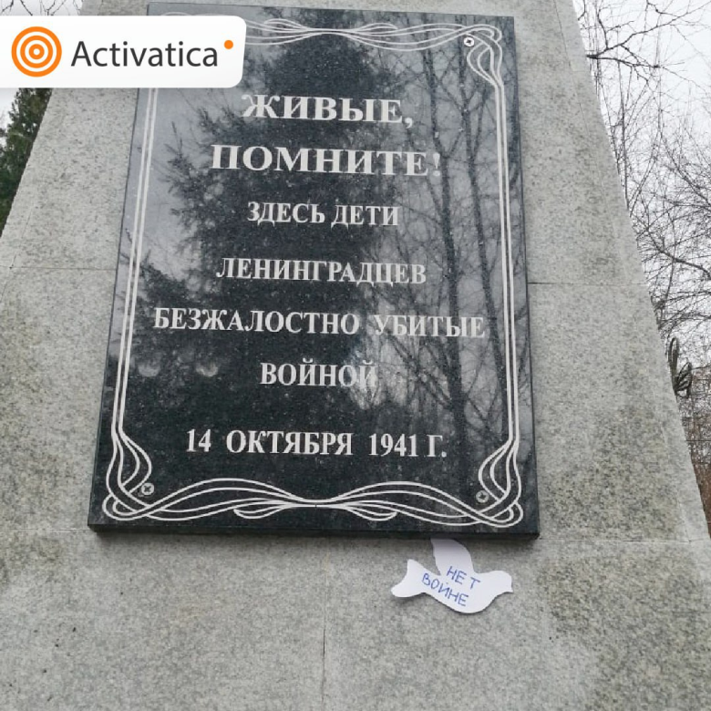 Taube mit Aufschrift „Nein zum Krieg“ am Denkmal für die Kinder Leningrads, umgebracht im Oktober 1941.