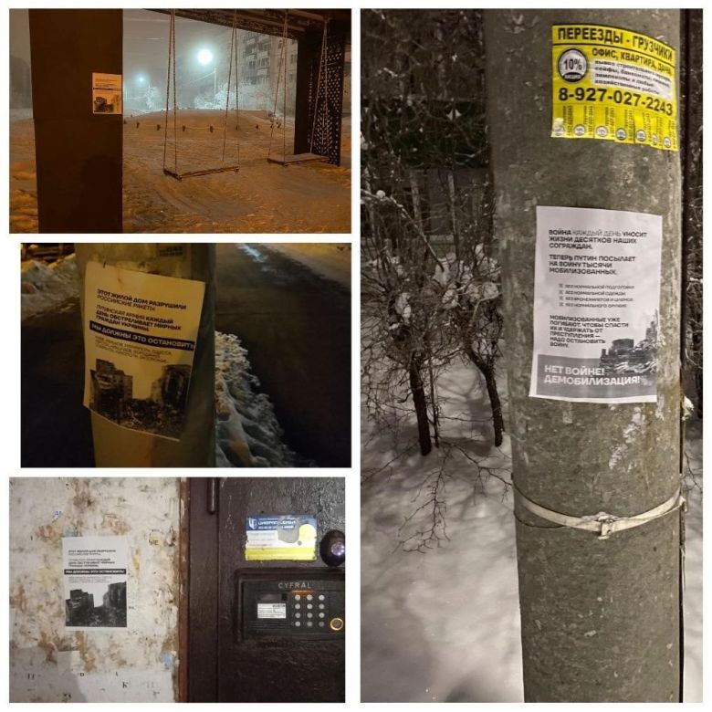 Antikriegsflugblätter in Jakutien, im Gebiet Sverdlovsk und Samara, in St. Petersburg, Moskau und in der Region Primorje mit der Bezeichnung ukrainischer Städte, mit Fotografien zerstörter Häuser und Aufschriften: „Dieses Wohnhaus haben russische Raketen zerstört. Putins Armee beschießt täglich friedliche Bürger der Ukraine. Wir müssen das stoppen.“ „Nein zum Krieg. Demobilisierung!“
