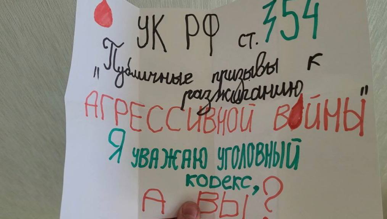 Am 18. März wurde in Moskau gegen den 17-jährigen Oleg Blagov ein Protokoll wegen „Diskreditierung der Armee“ aufgenommen. Oleg Blagov hatte auf dem Roten Platz eine Einzelkundgebung abgehalten mit einem Plakat, auf dem stand: „StGB RF Artikel 354: \'Öffentliche Aufrufe zum Angriffskrieg\'. Ich respektiere das Strafgesetzbuch, und ihr?“