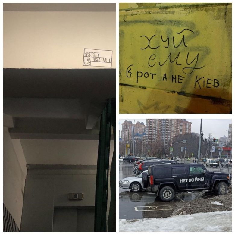Moskau. Aufschrift an einem Hauseingang: „Im Krieg verlieren alle“, an einer Hauswand: „Den Schwanz ihm in den Mund und nicht Kyjiv“, auf einem Auto: „NEIN ZUM KRIEG!“