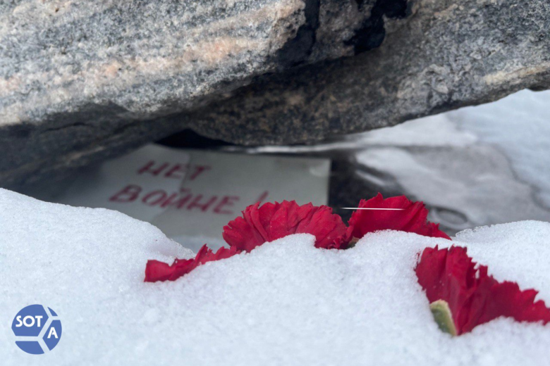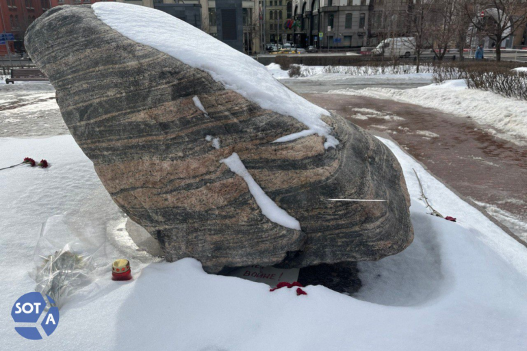 Blumen und ein Plakat mit der Aufschrift „Nein zum Krieg!“ liegen schon die dritte Woche am Solovezkij-Stein gegenüber dem FSB-Gebäude auf dem Lubjanka-Platz in Moskau.