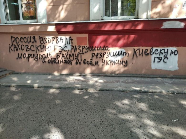 Aufschriften auf einer Hauswand: „Russland hat das Wasserkraftwerk Kachovka gesprengt, Mariupol und Bachmut zerstört, wird das Wasserkraftwerk in Kyjiv zerstören und gibt an allem der Ukraine die Schuld.“ Die Stadt, in der die Aufschriften aufgetaucht sind, ist nicht bekannt.
