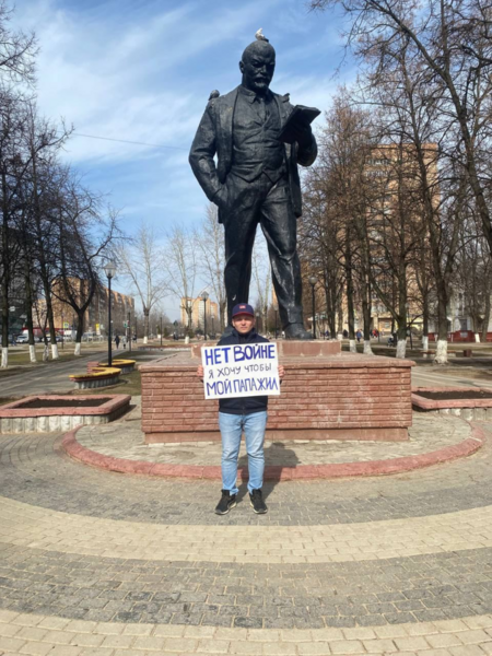 Am 30. März wurde in Rjazan Lev Sokolov mit dem Plakat „Nimm\' mich fest, wenn du gegen den Krieg bist! Die militärische Spezialoperation ist sinnlos und gnadenlos“ festgenommen. Lev führte die Demonstration am Platz des Sieges durch.