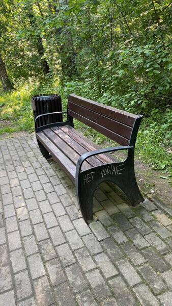 Auf der Bank: „Nein zum Krieg“. Aufkleber auf einer Autoscheibe: „#Ich bin für Frieden“.