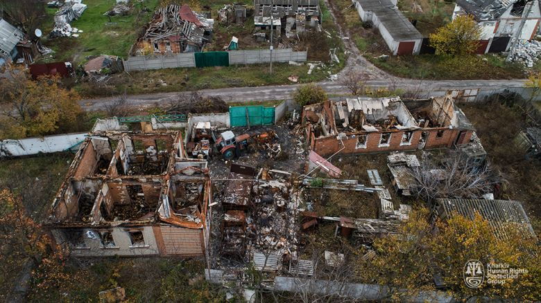 Zerstörungen in Ruski Tyschky im Gebiet Charkiv, dokumentiert von der ChMG