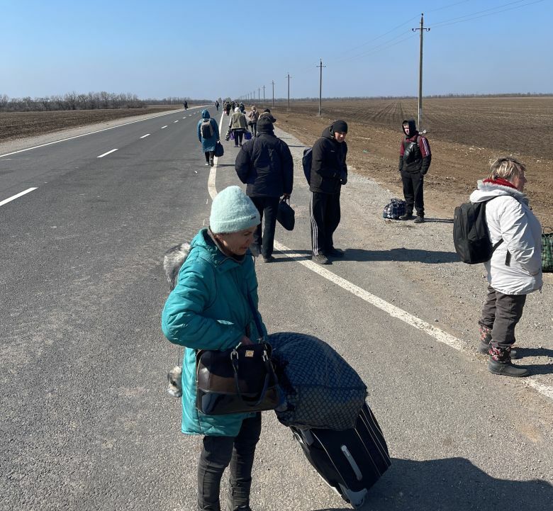 Am 20. stellten wir fest, dass sich die Lage etwas beruhigt hatte. Und es war wärmer geworden. Am 21. ging ein Mann aus unserem Schutzraum in eine Richtung und ich in eine andere, um die Lage zu erkunden. Wir sahen, dass die Einschläge jetzt weiter weg von uns waren. Wir versammelten alle, die wollten, in unserem Schutzbunker. Ich erklärte, dass wir am nächsten Morgen um 8 Uhr rausgehen. Wer wollte, sollte sich vorbereiten, es sollte nur das Notwendigste mitgenommen werden. Jeder sollte seine eigenen Sachen tragen. Und wir gingen schnell, wir wollten es wenigstens bis Nikolske oder Manhusch schaffen. Von dort aus sollte es Busse geben. Weil eine Regierungsmitarbeiterin – der Name beginnt mit V und endet mit ereschtschuk – gesagt hatte, dass vom 15. an täglich Busse aus Manhusch nach Berdjansk verkehren würden. Als wir in Manhusch ankamen, fragte ich bei den Ortsbewohnern nach. „Ljoscha, seit dem 24. Februar hat es keinen einzigen offiziellen Bus von Manhusch nach Berdjansk gegeben.“