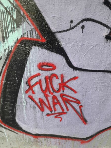 Nein zum Krieg. Frieden. NEIN ZUM KRIEG. Wir sind durch Zaozerje gekommen. [in etwa:] Fick den Krieg.