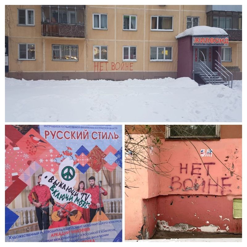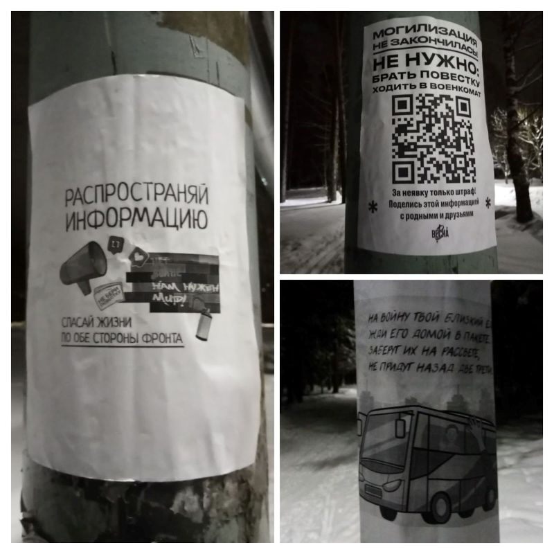 „Verbreite Information. Wir brauchen Frieden! Rette Leben auf beiden Seiten der Front“, „Die Mogilmachung ist nicht zu Ende! [Russ. mogilisazija aus mogila: Grab und mobilisazija Mobilmachung] Nicht nötig: die Vorladung entgegennehmen, zum Einberufungsamt gehen. Für Nicht-Erscheinen gibt es nur Geldstrafen. Teile diese Information mit Angehörigen und Freunden“, „Dein Angehöriger zieht in den Krieg, erwarte ihn zuhause zurück in einem Sack. Man holt sie ab im Morgengrauen, zwei Drittel kommen nicht zurück.“