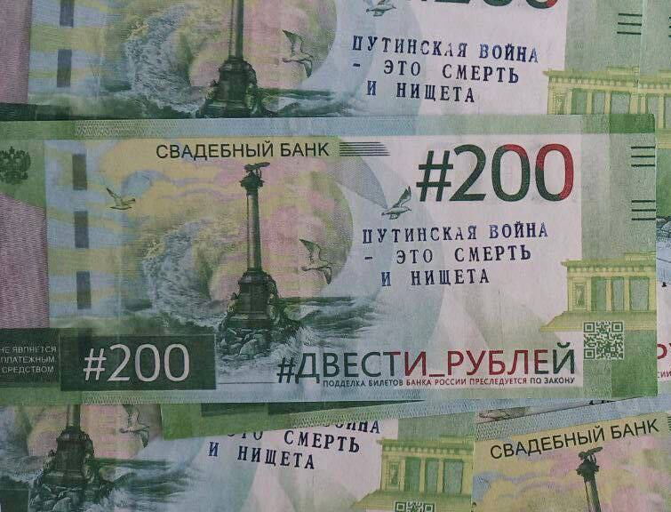„#200 Putins Krieg – das ist Tod und Elend“ [200: Chiffre für Gefallene], „Das ganze Geld geht für den Krieg drauf“, „Die Preise steigen wegen des Kriegs“, „Dies ist ein Anti-Kriegs-Geldschein. Sie müssen jetzt daran denken, dass Russland einen aggressiven, brudermörderischen Krieg losgetreten hat und Putin unsere Zukunft raubt.“
