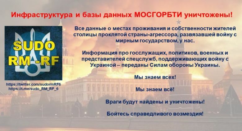 Hacker der Vereinigung Sudo rm-RF haben die Seite des Moskauer Büros für Technische Inventarisierung [MosgorBTI] gehackt. Die Hacker haben außerdem eine Erklärung veröffentlicht, dass die Daten aller Staatsbeamten, Politiker, Soldaten und Vertreter der Spezialdienste, die den Krieg unterstützen, den ukrainischen Verteidigungskräften übergeben wurden.