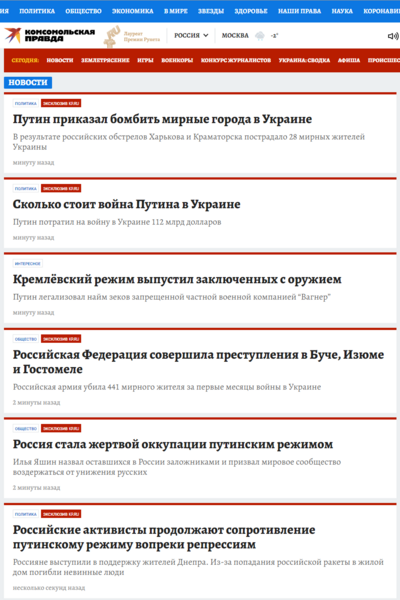 Auf der Seite der Propaganda-Zeitung „Komsomolskaja Pravda“ tauchten Artikel über den Krieg in der Ukraine auf. Diese hatte der ehemalige Journalist der Zeitung Vladimir Romanenko, der inzwischen das Land verlassen hat, auf die Webseite gesetzt. Romanenko nannte seine Aktion „Sühnung der Schuld“. Der frühere Zustand der Seite wurde mittlerweile wiederhergestellt. Auf der Serviceseite „Webarchiv“ kann man sehen, wie diese Seite aussah. Die Überschriften der Artikel waren folgende: „Putin befahl Bombardierung friedlicher Städte in der Ukraine“, „Wie viel kostet Putins Krieg in der Ukraine“, „Das Kreml-Regime lässt Häftlinge mit Waffen frei“, „Die RF hat Verbrechen in Butscha, Isjum und Hostomel begangen“, „Russland ist Opfer der Okkupation von Putins Regime geworden“, „Russische Aktivisten kämpfen trotz Repressionen weiter gegen das Putin-Regime“.